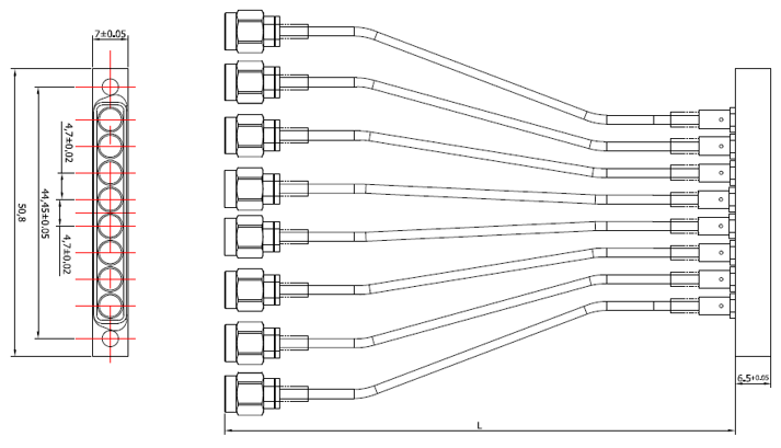 ![]() | 型號:SCGP8-292MGPPF-XXX 描述:8通道柔性電纜組件 ,2.92公頭-GPPO母頭,DC-40GHz,配接Micro-Coax原裝進口電纜HFE100D 阻抗:50Ω |